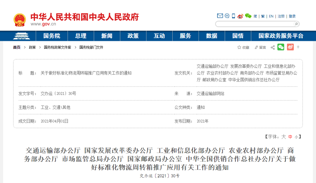 4月25日消息,交通运输部、国家发展改革委、工业和信息化部、农业农村部、商务部办公厅、市场监管总局、国家邮政局、中华全国供销合作总社八部门联合发布通知——《交通运输部办公厅 国家发展改革委办公厅 工业和信息化部办公厅 农业农村部办公厅 商务部办公厅 市场监管总局办公厅 国家邮政局办公室 中华全国供销合作总社办公厅关于做好标准化物流周转箱推广应用有关工作的通知》(以下简称《通知》),决定在全国推广应用标准化物流周转箱,以加快推进物流包装绿色转型,着力构建现代物流体系。