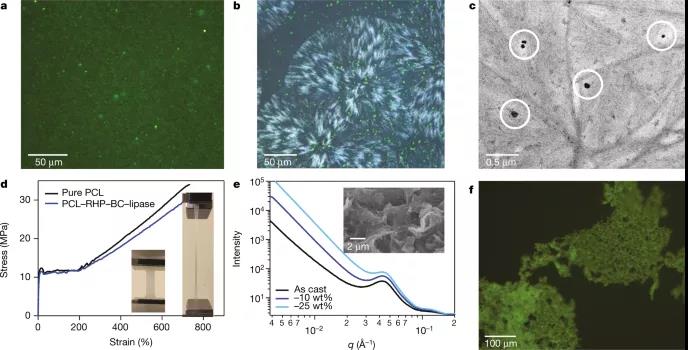 At the enzyme load of 0.02wt %, RHP lipase nanoclusters were evenly distributed throughout the whole region (Fig. 2a). RHP-BC lipase clusters, approximately 50 nm to 500 nm in size, are located between bundles of PCL tablets (Fig. 2C). Nanoscale dispersion and trace additives are the key to maintain the properties of the main body. The formation and change of nanopore structure during the degradation process were characterized by SAXS, DSC and scanning electron microscopy, and the conversion rate reached 98% within 24 h.